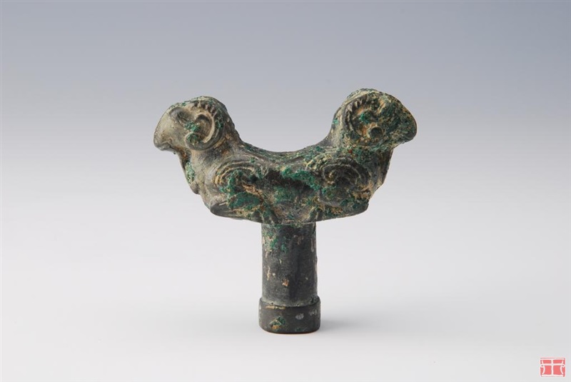 汉双羊形铜杖首,两羊相背,腹背相连且中空,双羊头间形成凹窝,羊双腿弯曲,呈跪卧状。羊角弯曲至颈上部,颔部长须与腹部相连,腿胛部刻线纹表现肌肉毛发,颈上部鼻眼嘴依稀可见。两羊中间空銎支撑,整体呈“丫”字形,从造型和纹饰来看带有明显的中原文化特征。虽然与鸠杖首相比,羊形杖首并没有在国家制度中有所体现,但其造型别致,工艺精湛,带有明显中原文化特征,亦是中原王朝政治文化影响的重要见证物。