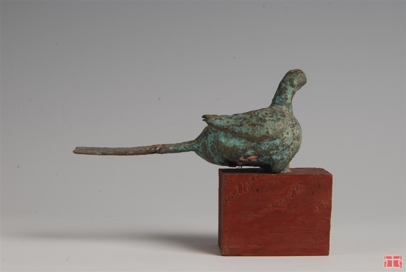 汉鸠形铜杖首,长14.5厘米,重425克,1981年容县杨村镇高垌村马腰岸口山坡出土。鸠昂首挺胸,翅微展,尾部修长,錾刻麦穗形纹三条,腹部有竖銎。整体形象灵动娇健。该件文物的出土向我们表明在汉代容县就已经有老人接受过汉王朝的赏赐。在汉代,容县与中原王朝的联系已相当紧密,汉文化的影响已经非常直接的影响到了这一区域。