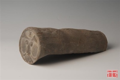 唐虎纹瓦当,长31.3厘米,宽12.6厘米,面径12.5厘米,重1790克,1982年12月原容县博物馆文物仓库出土。此瓦当呈半筒形,头部略大,尾部略小,正面饰怒目狰狞的虎头纹,虎额上饰“王”字,尾部有阶梯状接口。