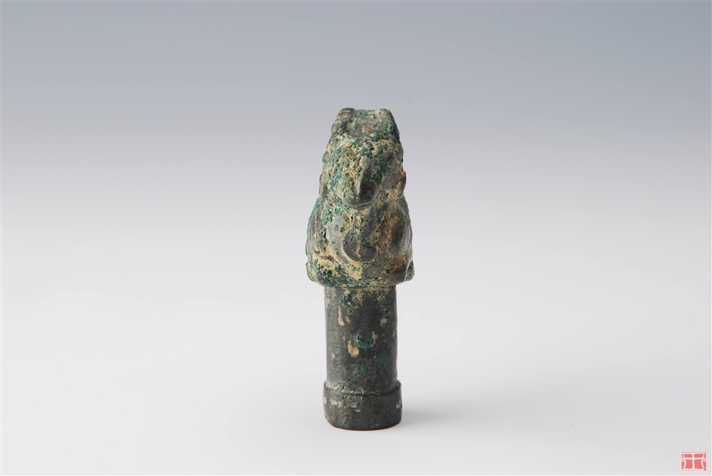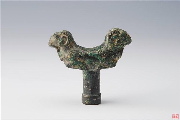两羊相背,腹背相连且中空,双羊头间形成凹窝,羊双腿弯曲,呈跪卧状。羊角弯曲至颈上部,颔部长须与腹部相连,腿胛部刻线纹表现肌肉毛发,颈上部鼻眼嘴依稀可见。中空銎支撑双羊,整体呈“丫”字形。銎下端饰凸弦。銎高3.8厘米,径1.9厘米,壁厚0.2厘米,凸弦宽0.9厘米。